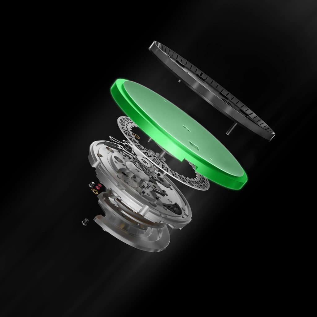 Urverket er et selvtrekkende mekanisk ETA Powermatic 80, som har en gangreserve på imponerende 80 timer. Balansefjæren er laget av den innovative legeringen Nivachron, som kan redusere den negative påvirkningen fra magnetfelt med en faktor på 10 til 20 sammenlignet med en konvensjonell fjær.