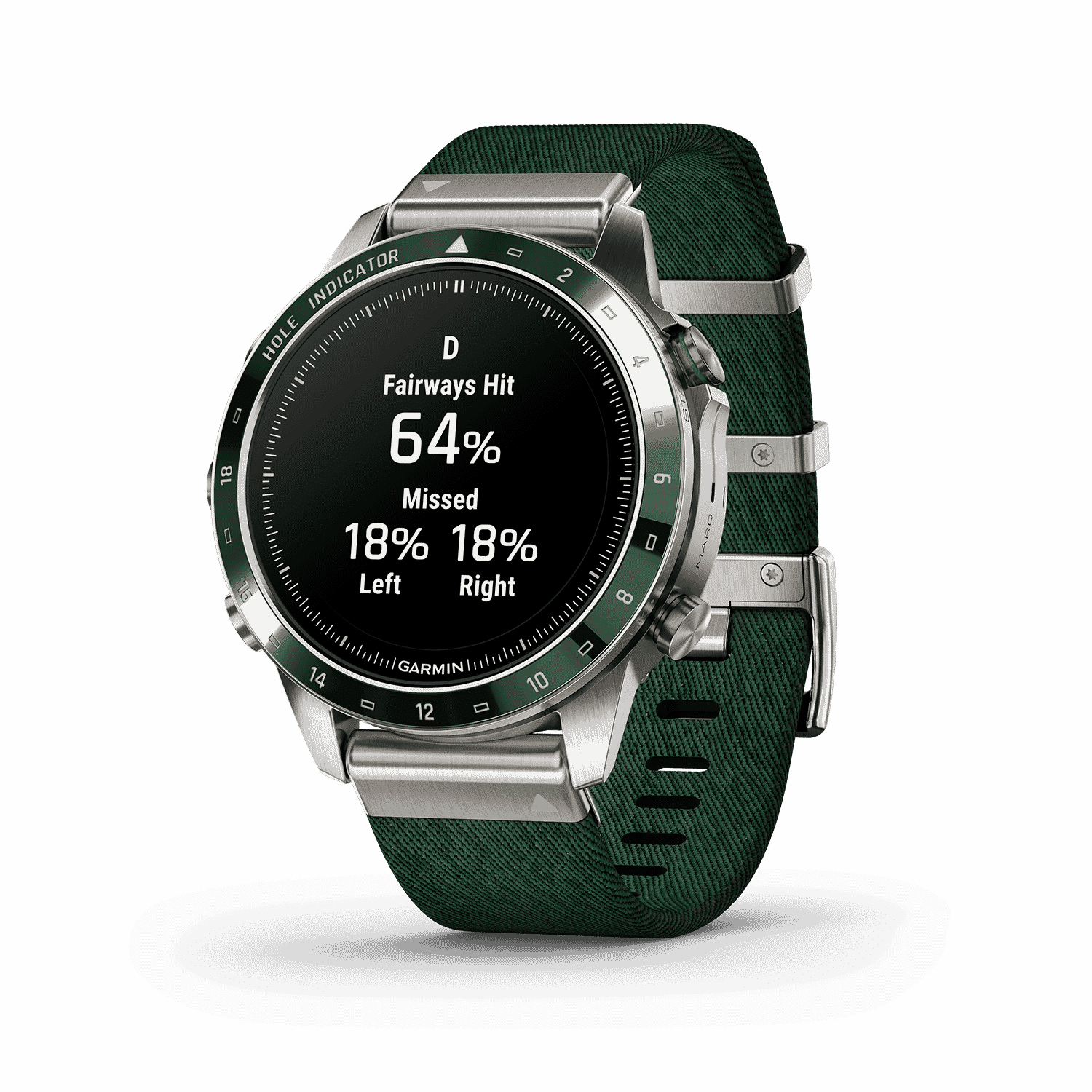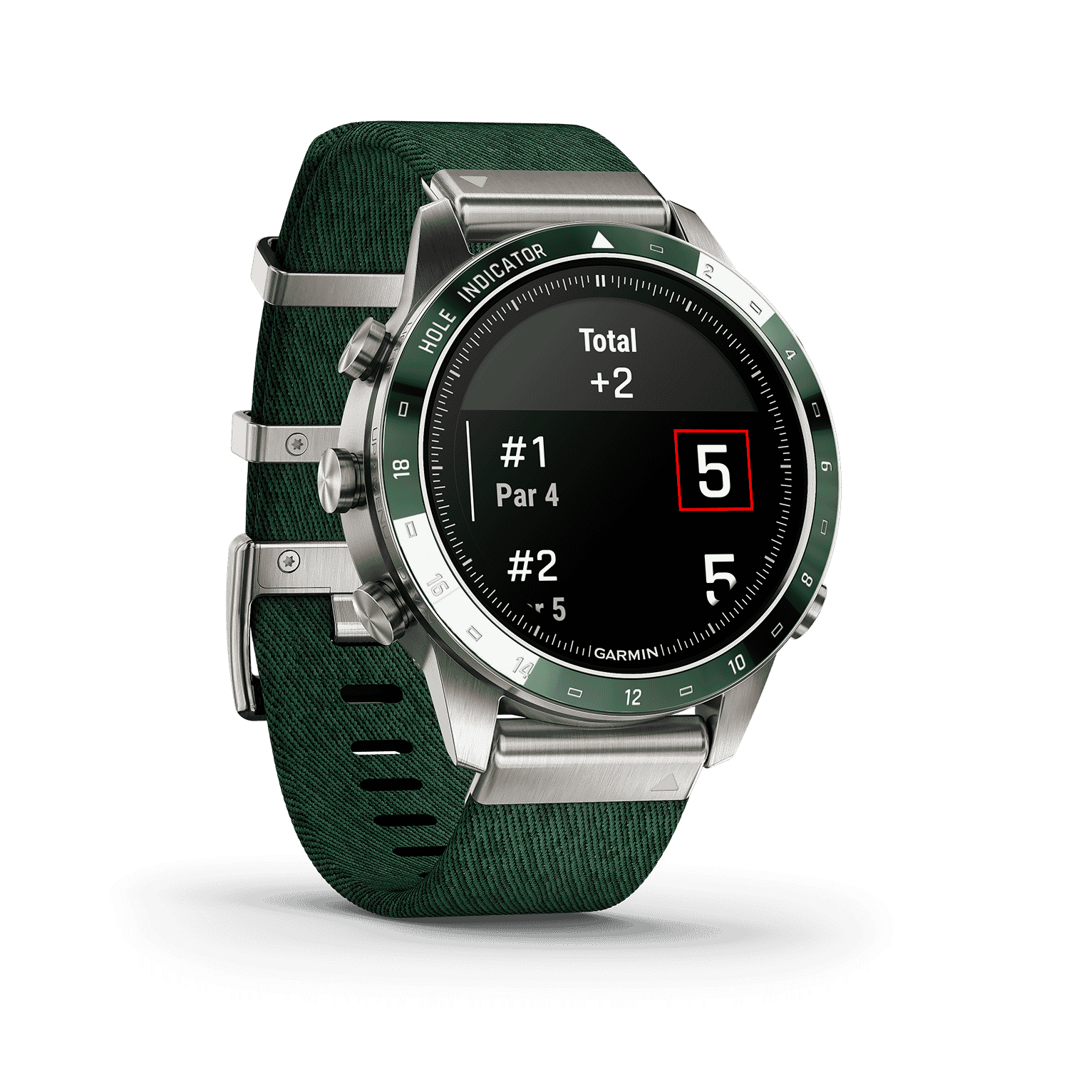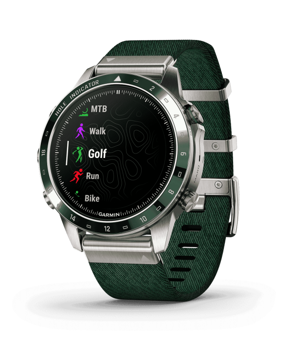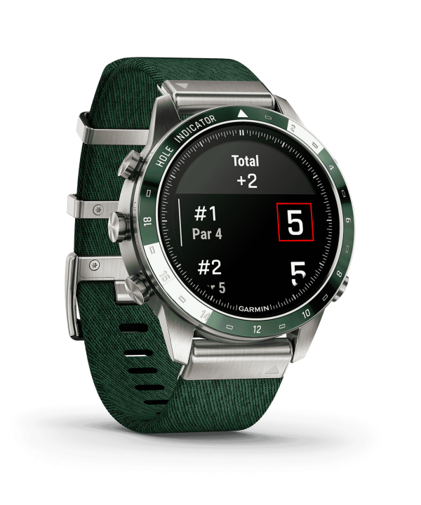 - Har en fantastisk AMOLED-berøringsskjerm med safirglasslinse og egendefinerte markeringer for 1–18 golfhull på den keramiske beselen med inkrustasjon