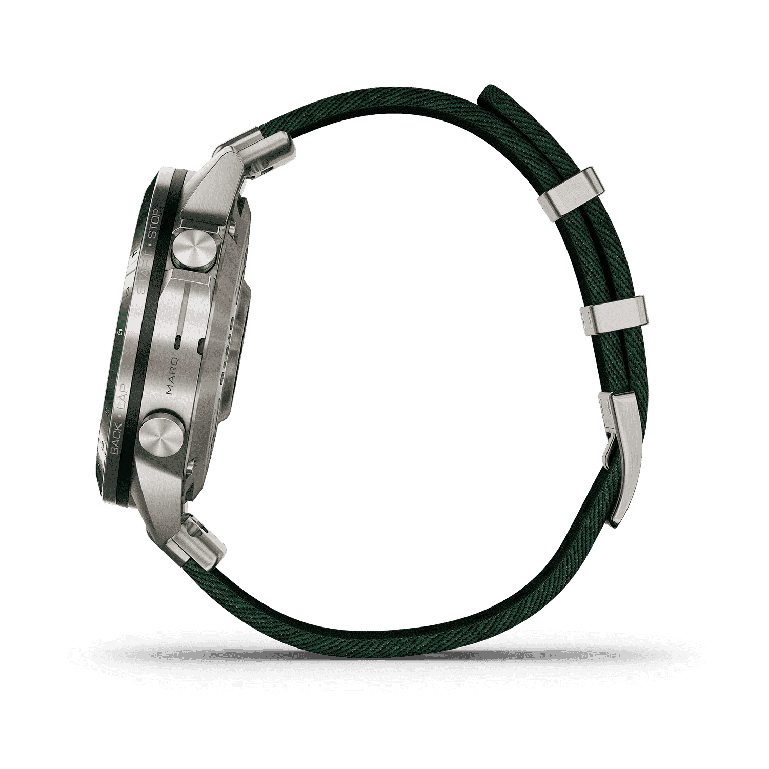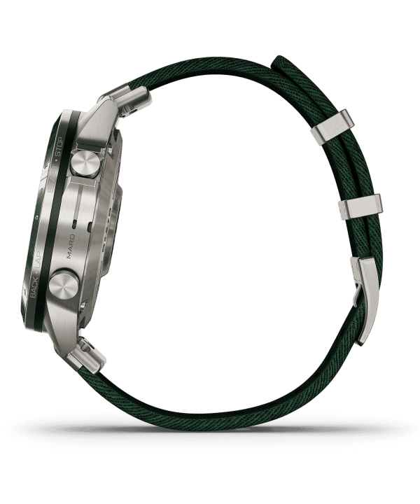 - Denne premium klokken har et presisjonsdesign med en 46 mm urkasse laget av ultrahard titan av klasse 5 med en furugrønn hullindikator med keramisk inkrustasjon. Den intrikate jacquard-vevde nylonremmen har en førsteklasses QuickFit®-mekanisme